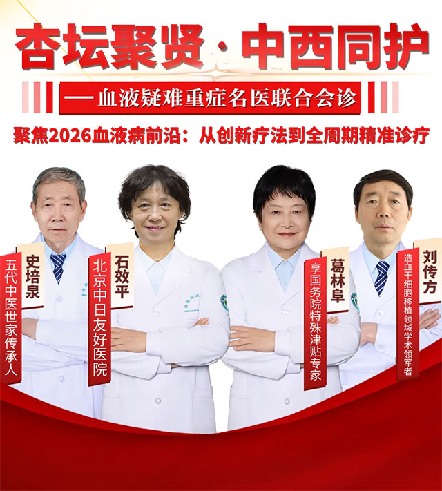 2026年4月14日-17日,北京中日友好医院石效平教授亲临我院,带来第58期《中医看血液》专题讲座;并将联合五代中医世家传承人史培泉主任、国家级血液病专家葛林阜院长、造血干细胞移植领域领军者刘传方教授,开展多学科联合会诊。